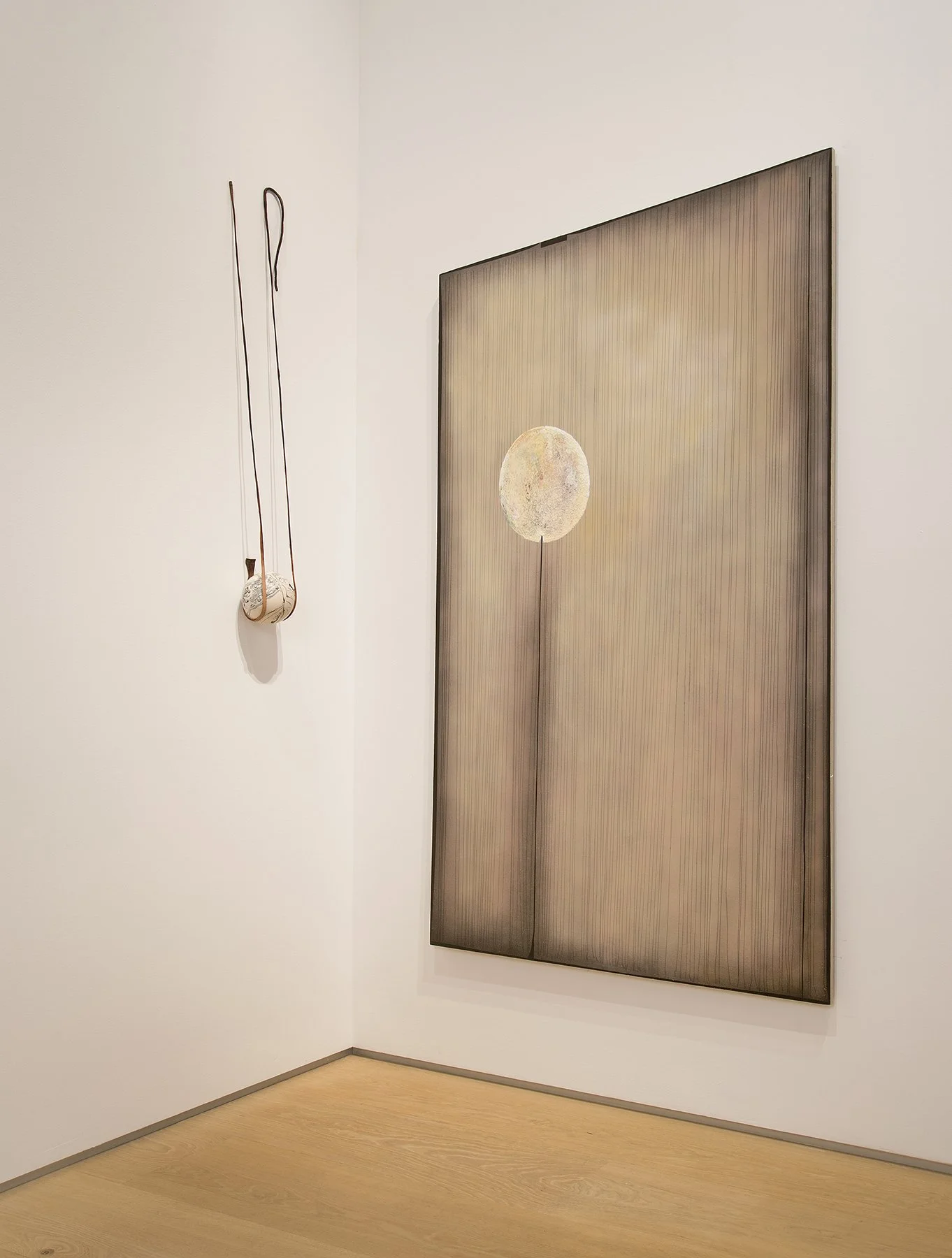 The paintings and objects gathered here seem to impart a sense of individual personalities or subjectivities; they are materially sensual, tactile, and evocative of the body. Stuart’s works are indeed, often, replete with orifices, umbilici, limbs, or membranes. Arranged in the gallery space, they are frequently described as characters or, intimately paired with each other, cliques, in conversation. Many of her works involve techniques of rupturing, suturing, pulling apart, weaving together, braiding, threading through, or spranging (which is an ancient plaiting technique that involves the manipulation of the warp in the absence of the weft) – techniques that are evocative of bridgings or unions, and perhaps also of dialogue or exchange.